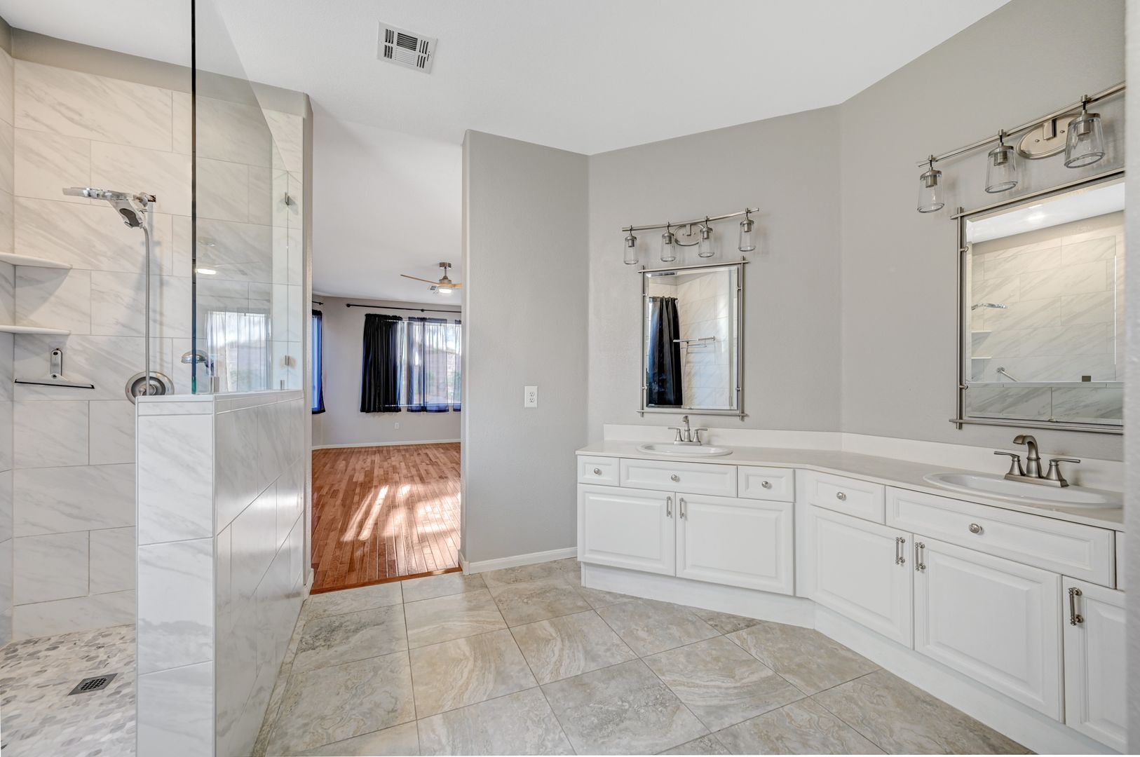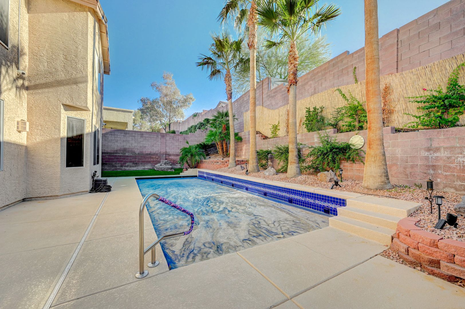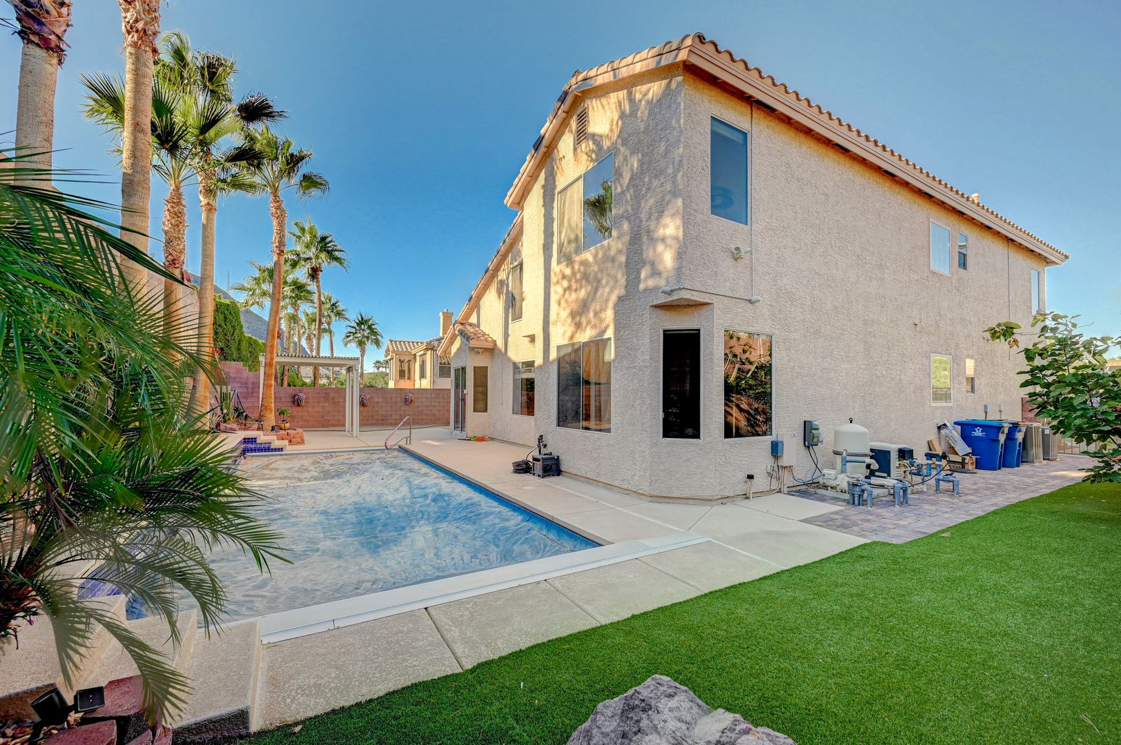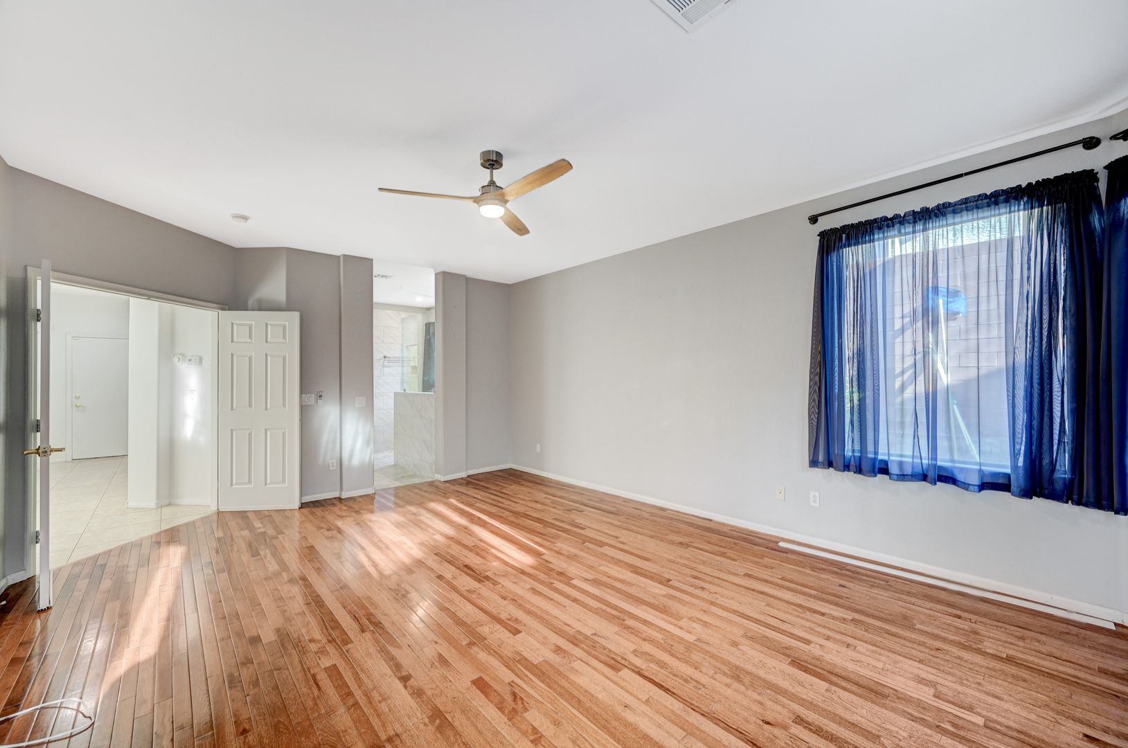 This stunning 4 bedroom, 3.5 bathroom home in the guard-gated community of Palm Hills is the perfect retreat for you and your family. With 3,151sqft of living space and beautiful curb appeal, this home is sure to impress. As you enter the front door, you'll be greeted by mesmerizing high ceilings and tons of natural light that highlights the actual HARDWOOD floors throughout the home. The fully equipped kitchen boasts stainless steel appliances, granite countertops, tons of cabinetry, and a pantry, making it the perfect space for cooking and entertaining. Step outside to your entertainer's paradise and take a dip in the beautiful salt-water pool. Artificial turf installed on both sides of the home, tons of palms, shrubs & 2 fruit-producing Fig trees, create a serene outdoor living space perfect for relaxing with family and friends. This home offers 2 primary bedroom suites, with one conveniently located downstairs, which is fully handicap accessible with a roll-in shower, grab bars, and an enlarged toilet. The primary bedroom suite upstairs features double sinks, a separate tub/shower, and a custom walk-in closet, providing a luxurious and private retreat. The 3-car garage and RV parking are an added bonus that will provide ample space for all of your toys. This home is truly a rare find in a sought-after community