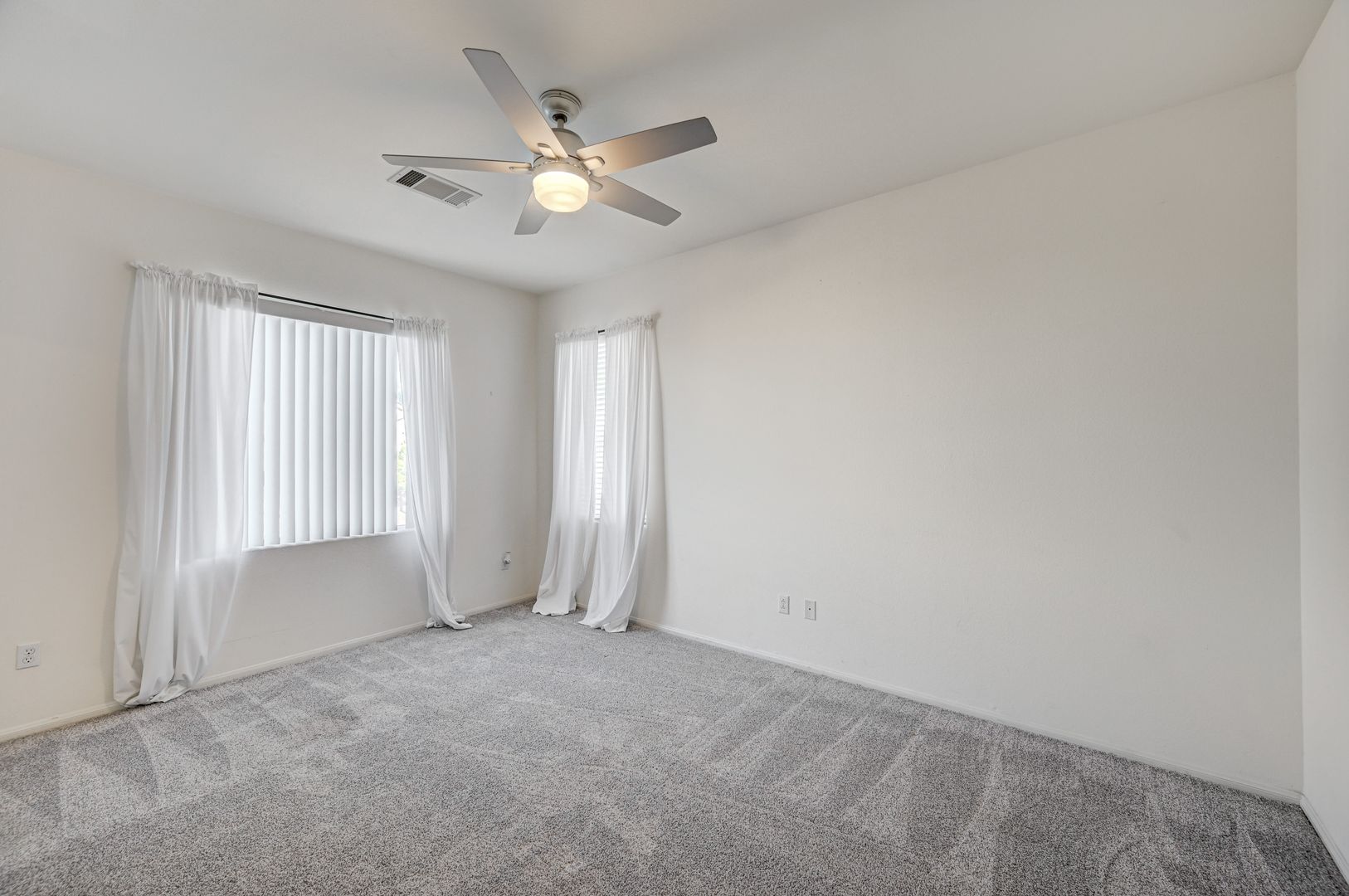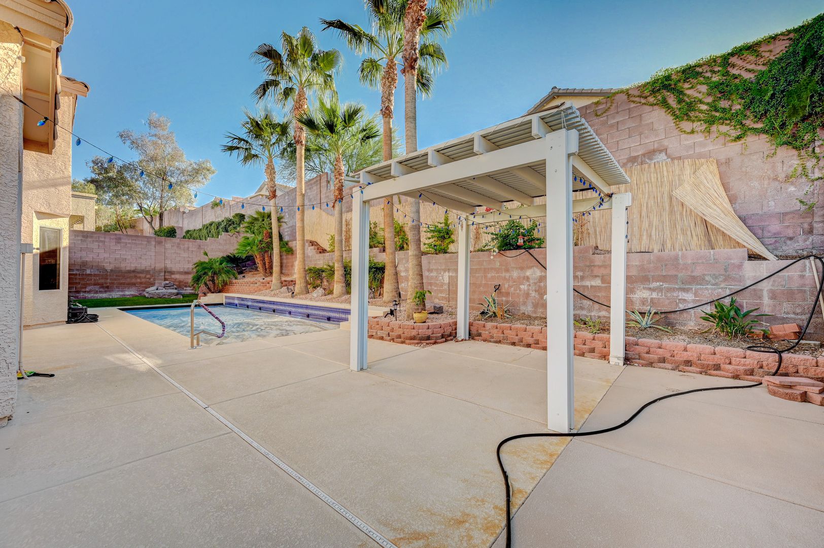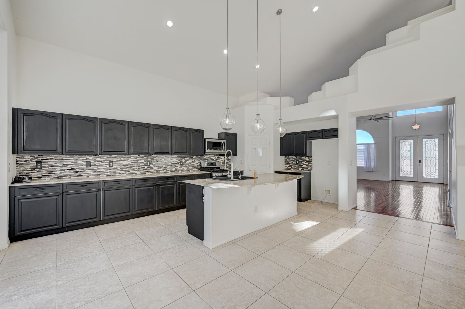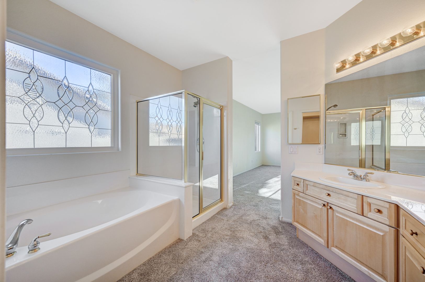 This stunning 4 bedroom, 3.5 bathroom home in the guard-gated community of Palm Hills is the perfect retreat for you and your family. With 3,151sqft of living space and beautiful curb appeal, this home is sure to impress. As you enter the front door, you'll be greeted by mesmerizing high ceilings and tons of natural light that highlights the actual HARDWOOD floors throughout the home. The fully equipped kitchen boasts stainless steel appliances, granite countertops, tons of cabinetry, and a pantry, making it the perfect space for cooking and entertaining. Step outside to your entertainer's paradise and take a dip in the beautiful salt-water pool. Artificial turf installed on both sides of the home, tons of palms, shrubs & 2 fruit-producing Fig trees, create a serene outdoor living space perfect for relaxing with family and friends. This home offers 2 primary bedroom suites, with one conveniently located downstairs, which is fully handicap accessible with a roll-in shower, grab bars, and an enlarged toilet. The primary bedroom suite upstairs features double sinks, a separate tub/shower, and a custom walk-in closet, providing a luxurious and private retreat. The 3-car garage and RV parking are an added bonus that will provide ample space for all of your toys. This home is truly a rare find in a sought-after community