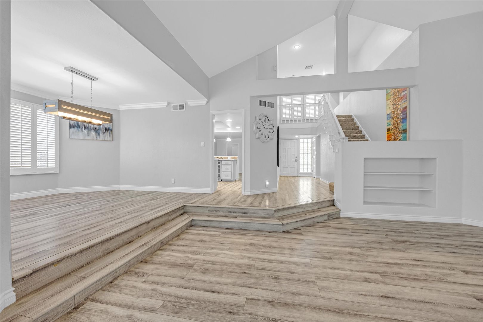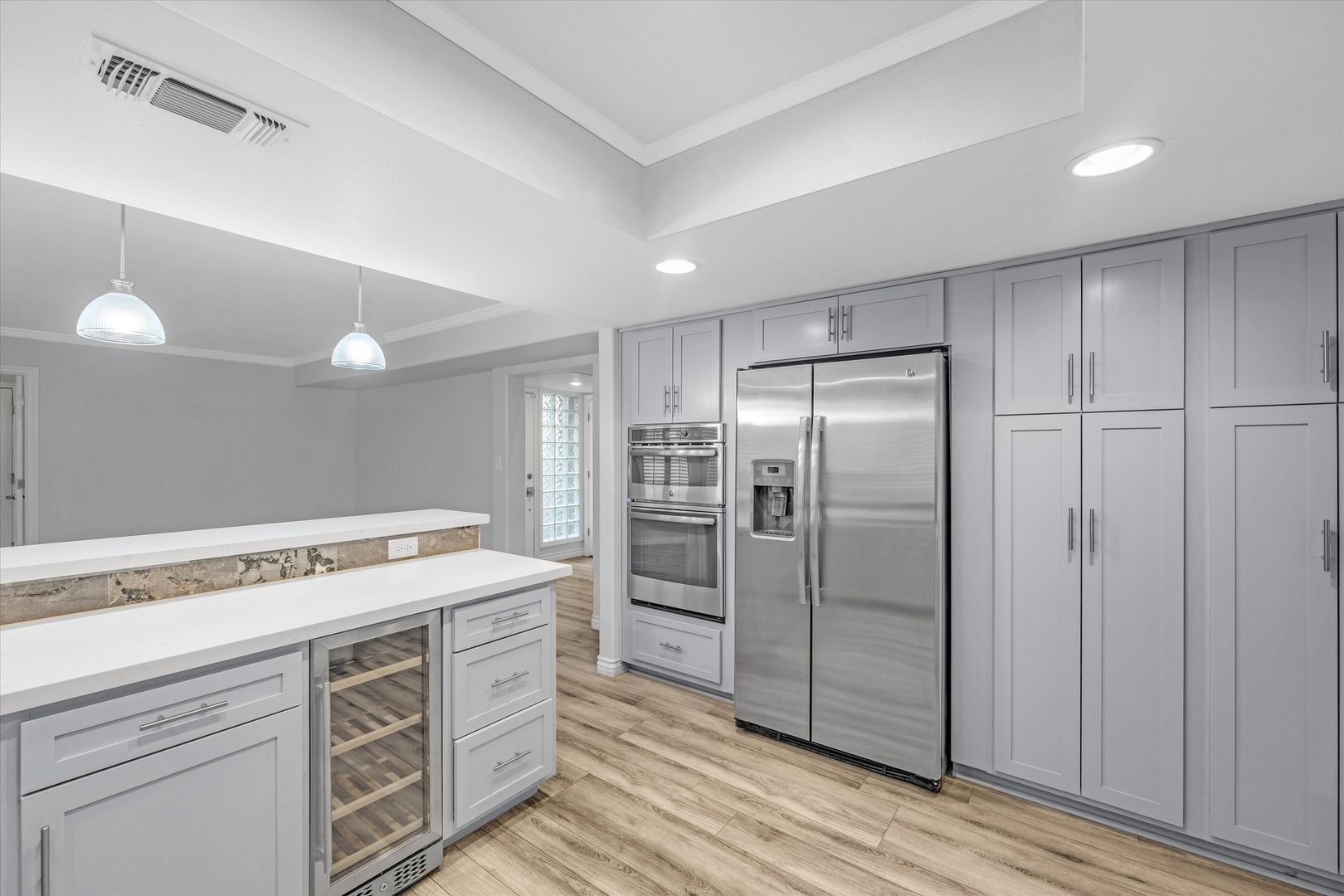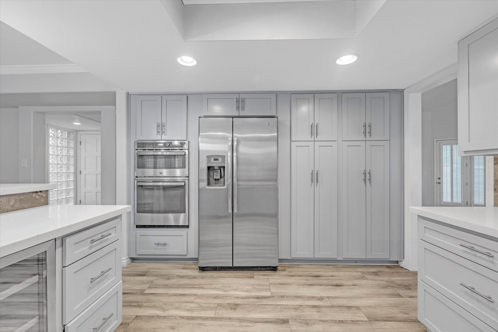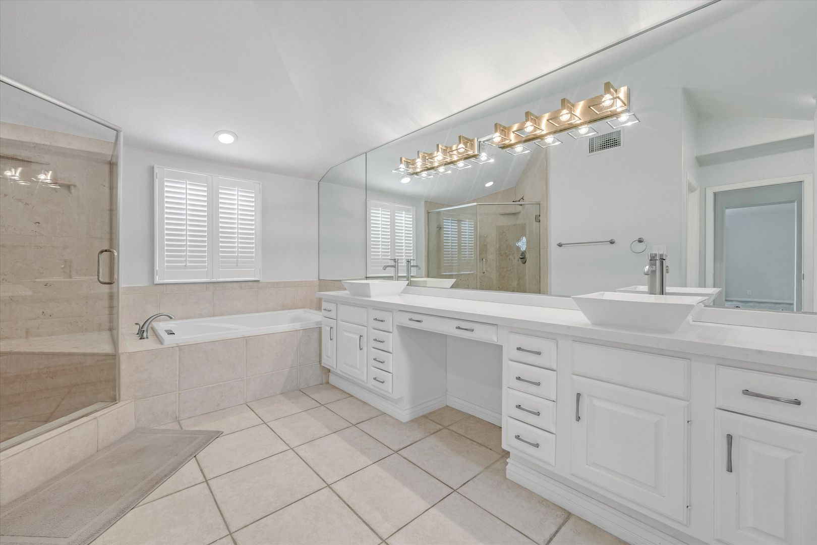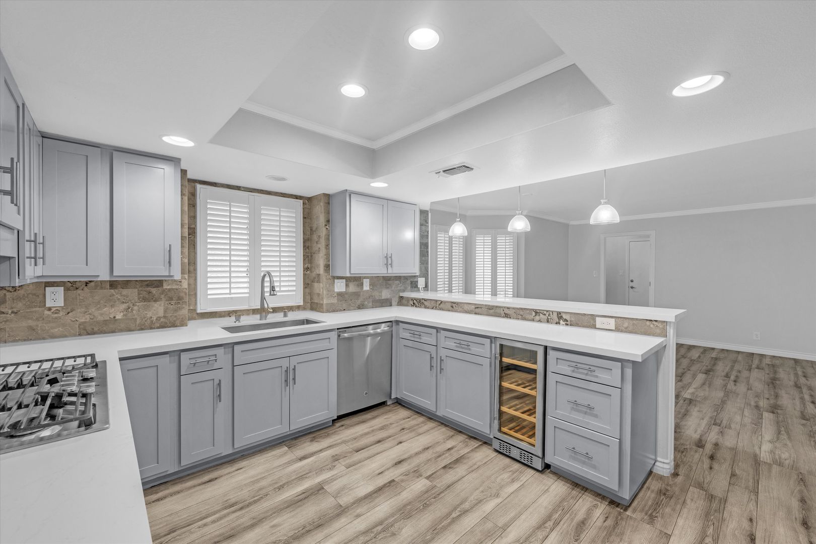 Beautiful, two-story, 3-bedroom Home. Custom kitchen with glass Back Splash, Stainless Steel Appliances Stainless Steel Sink, Refrigerator and Wine Cooler, Hand scraped plank flooring, New designer carpet, Quartz Kitchen and Bath counter tops, New lighting, vessel sinks and new Landscaping, Beach Entry Heated Pool. Perfect for entertaining or staying in, pure luxury comfort in a first-class gated golf course community. Won't last, tour it NOW.